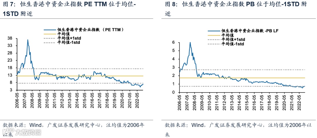 截至23.03.17恒生中资企业指数PE TTM为7.1,PB为0.77,均处于06年以来均值-1STD附近的低位水平。
