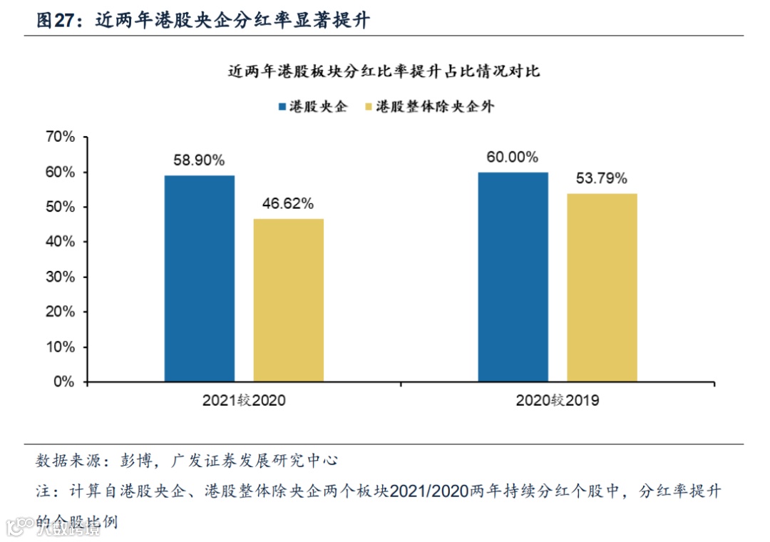近两年港股央企分红率有所提升,超半数分红的央企在持续加大分红比率。
