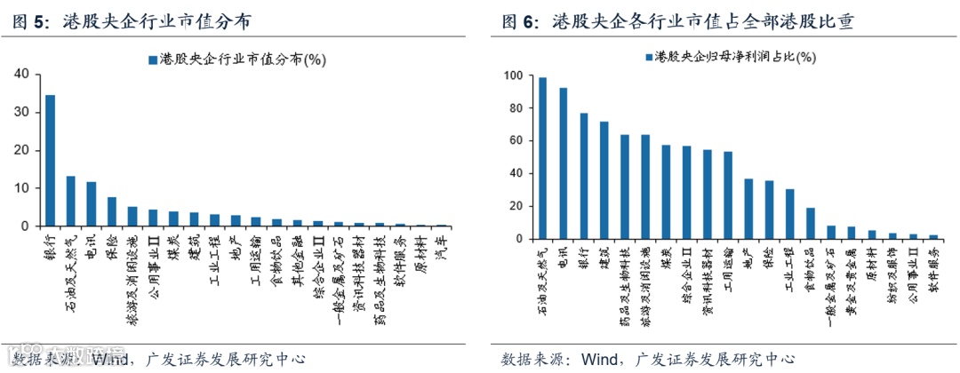港股央企所属央企集团涵盖了A股央企集团的关键行业,包括银行、保险、地产、电信、石油化工、电力等。据Wind数据,截至2023年3月10日,港股央企主要集中在银行(34%)、石油及天然气(13%)、电讯(11.6%)行业;从港股央企在该行业中的净利润占比来看,港股央企在石油及天然气、电讯、银行、建筑、生物科技等行业中均具有主导地位。