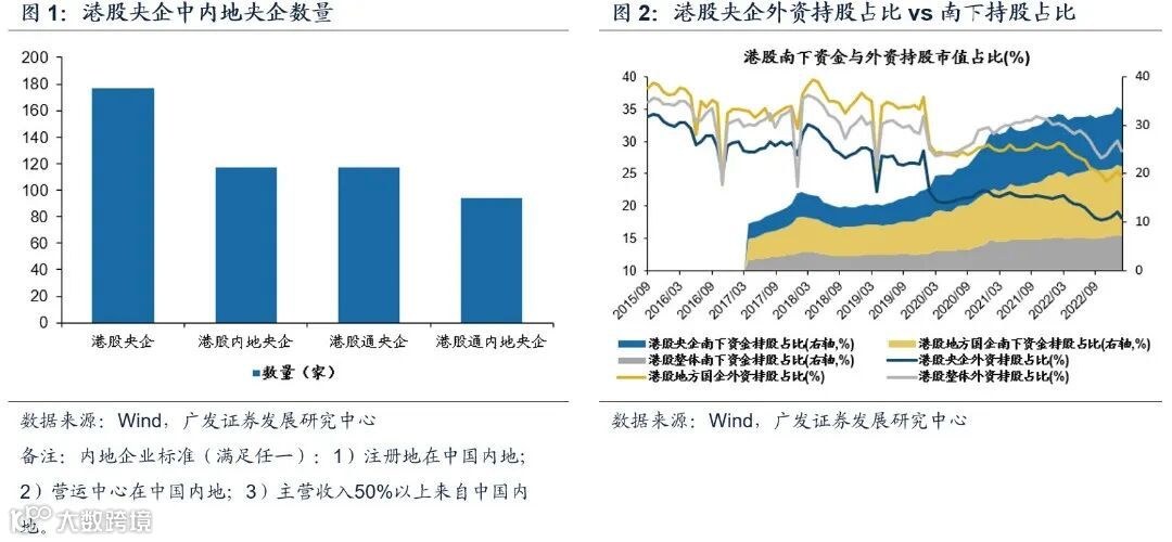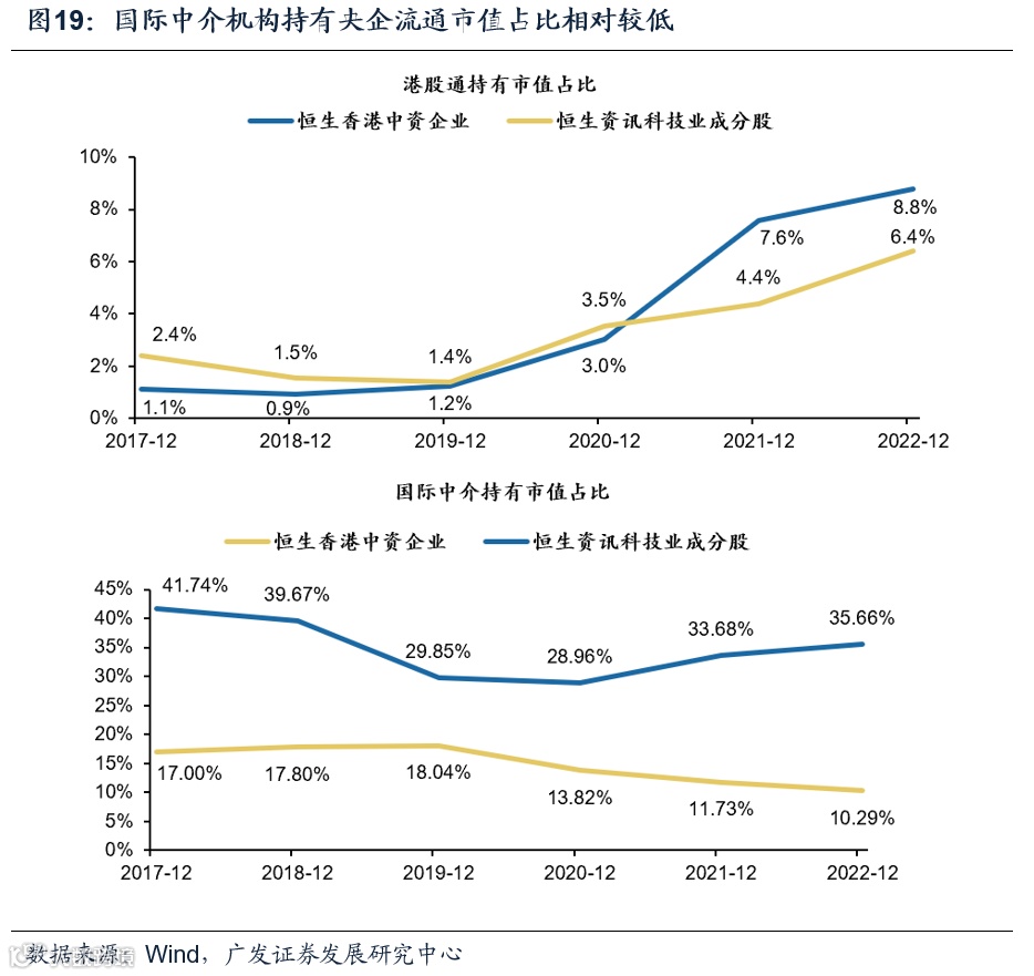外资对港股央国企持股比例相对较低——22年底国际中介对恒生中资企业指数成分持有占比仅10.3%,也将敏感于内地资金的持有。