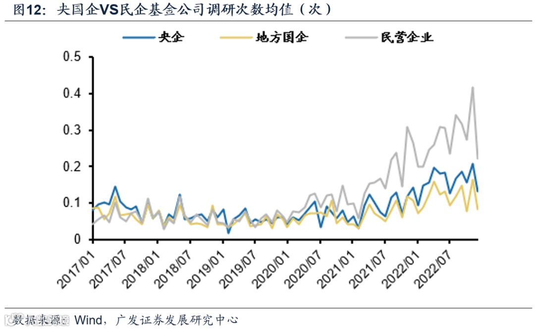 从机构调研角度看,央企和地方国企调研次数明显低于民企,根据Wind数据,央企和地方国企的机构调研次数明显低于民企,2022年12月,平均每家央企接受了0.13次基金公司调研、地方国企0.08次、民企0.22次。