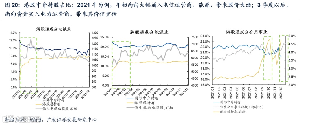 以21年为例,初南向资金大幅涌入电信运营商、能源板块,带来股价大涨,估值提振显著;21年3季度以后,南向资金买入电力运营商,亦带来其价值重估。