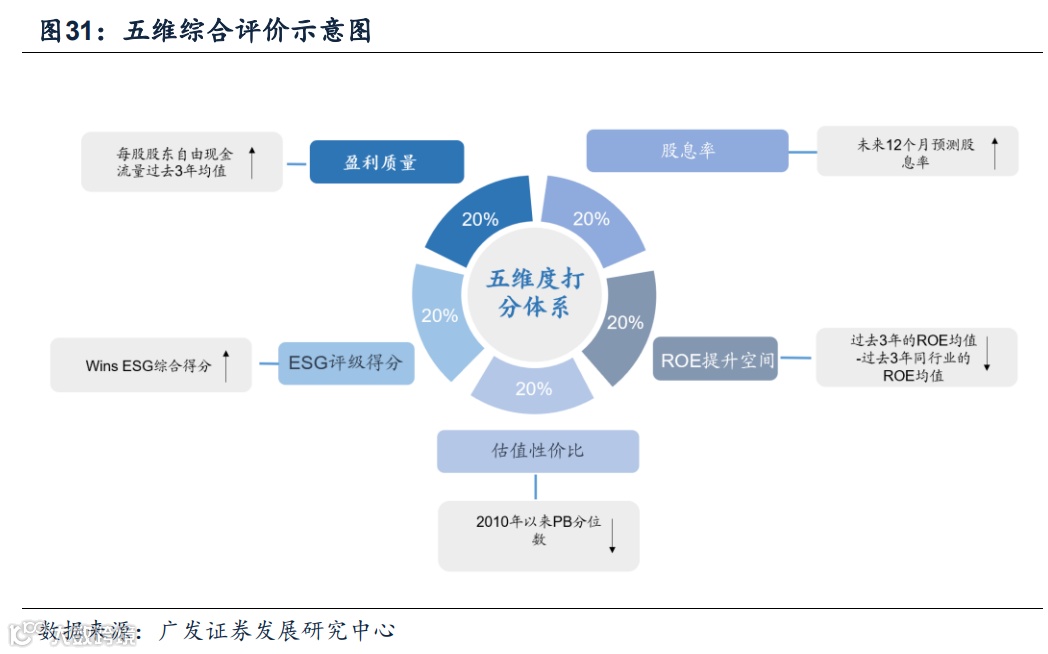ESG评级(20%):ESG评级高的公司资产价值应当更高。我们用Wind ESG综合得分衡量,计算在行业内的分位数并换算成得分。