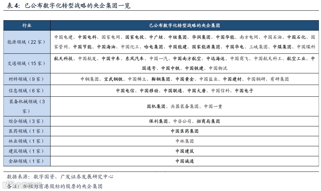 ROE提升路径之二:产业转型。(1)“卡脖子”技术领域,根据国资委规划,央企加大核心技术攻关、打造链长企业,包含攻克一批“卡脖子”的关键核心技术,关注“专精特新”标签。(2)数字化转型,据《数字国资》最新统计,目前超60家央企公布了数字化转型战略,主要聚焦在智慧能源和智慧交通领域。(3)绿色低碳转型,包括传统产业低碳改造(煤炭/钢铁)、布局新能源(光伏/风电)、循环经济(危废资源化)等。