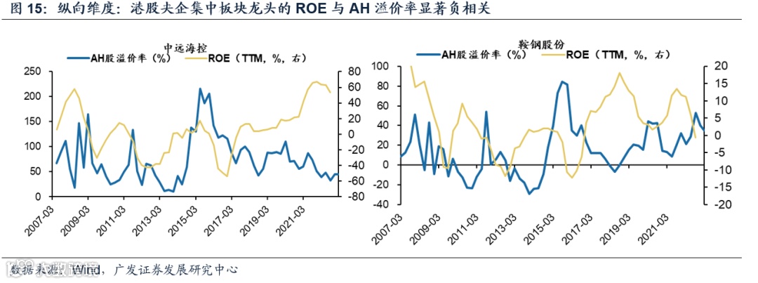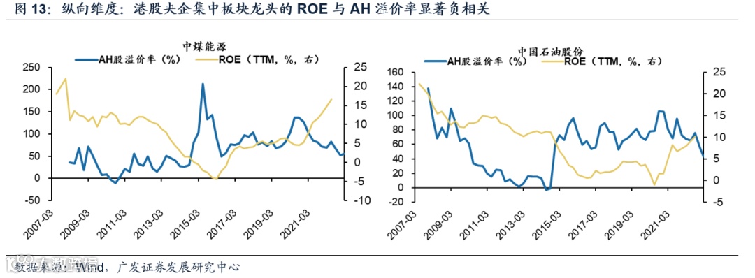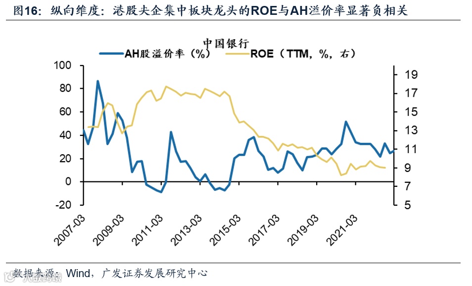 以中信一级行业口径来看,港股央国企各行业龙头截面数据显示,各行业AH溢价率与ROE呈现显著负相关,即截面ROE越高的行业,行业AH溢价率越低(注:ROE和AH溢价率数据均选取(2021Q1-2022Q3)七个报告期均值)。
