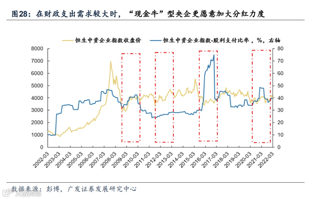 在财政支出需求较大时,“现金牛”型央企更愿意加大分红力度,中长期,在土地财政贡献下降背景下,央国企分红有望稳步提升。在2009年、2012年、2016年、2020年我国财政支出诉求较强的时间段,港股央企分红率均明显抬升。