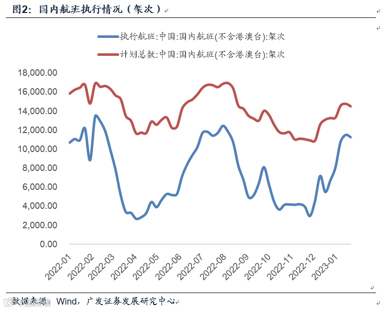 第一,春运客流同比增幅较大。节前陆续回乡,1月7日(春运第一天)-1月22日(春运第16天,正月初一)全国铁路、公路、水路、民航发送旅客同比落于38.9%-57.2%之间;节后集中返流,1月26日(初五)-1月28日(初七)同比增长高达85.9%、83.1%、75.8%。航空等前期受疫情影响的领域运输能力恢复迅速,1月国内执行航班日均10426架次,环比增长82.0%,较去年同期降幅大幅收窄为5.7%。