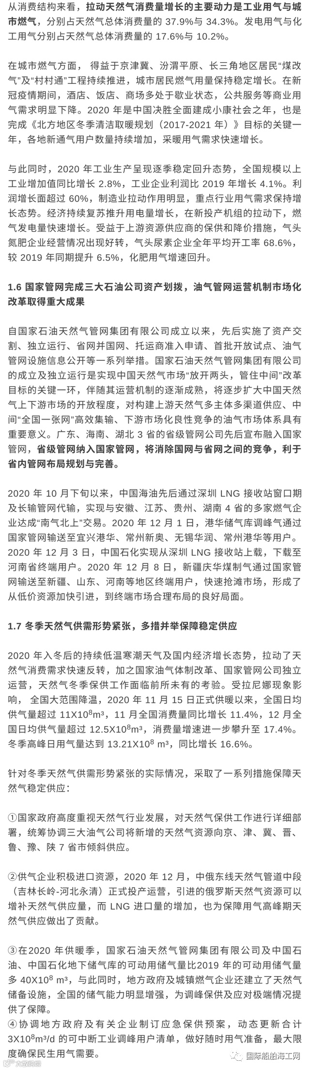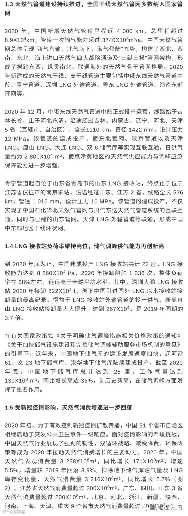 摘要:本文回顾了在突发新冠疫情及国家石油天然气管网集团有限公司成立的背景下,2020 年中国天然气产业链的发展,展望了 2021 年天然气行业的发展前景。