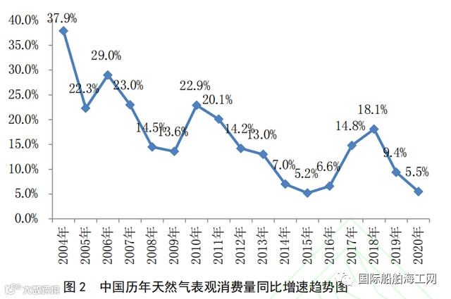 2020 年,中国天然气表观消费量达到 3238亿m,同比增长 5.5%;国产气增储上产态势良好,产量达到 1886亿m,同比增长 8.4%;进口天然气增速创新低,进口管道气与进口LNG 合计为 1363亿m, 同比仅增长 3.1%,对外依存度继续下降。2021 年,随着新冠疫苗大规模接种,国内生产生活秩序全面恢复,加之环保政策的驱动,天然气需求增量与增速水平将较 2020 年明显回升,预测市场需求增速将达到 8.6%。最后,针对中国天然气产业链发展,提出 3 点建议:①加快储气设施建设进度;②统一协调国内不同公司长贸资源的采购行为;③冬季对居民用气、非居民用气实行统一的上浮比例。