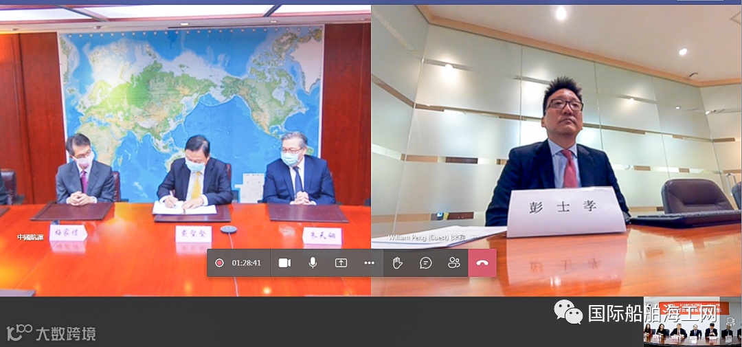 中国航运股份有限公司总经理戴圣坚、中国船舶工业贸易有限公司亚太部总经理阳宇和北船重工总经理谷克超共同签署了建造合同,中国航运股份有限公司董事长彭士孝,执行副总经理梅家礼,副总经理朱天翎,中国船舶工业贸易有限公司亚太部副总经理张民,北船重工党委书记、董事长王国海等出席了仪式。