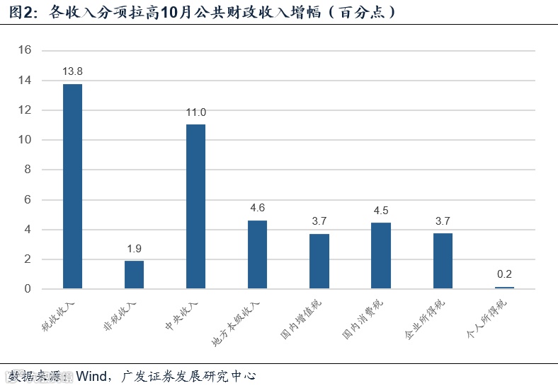 其他税种方面,在前期降幅收窄的基础上,10月土地与地产相关税种合并增速终于转负为正,对财政收入的贡献也由前期的下拉转为小幅上拉,或源自前期的房地产领域相关数据降幅收窄企稳,契税增速明显回升,房产税增速仍为正值,其它土地税种降幅未再扩大。进出口相关税种与外贸数据基本吻合,其中外贸企业出口退税在低基数情况下同比依然由正转负至-2.1%,与同期出口数据的放缓趋势一致,而进口货物增值税与消费税则较前期边际上行至10.9%,需要注意的是该税种与国内消费税类似均呈四季度波动较大特征。