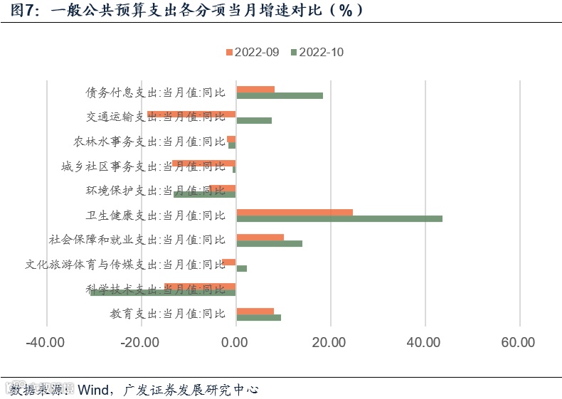 第四,经历了连续两个月的放缓后,10月财政支出增速有所回升,同比增速较前期上行3.3个百分点至8.7%;与收入端类似,10月支出进度也较近年同期水平均值略高。这主要来自卫生健康、社保就业、教育等公共事业相关支出的拉动,以及债务付息分项的贡献。而交通运输、农林水事务、城乡社区事务这三项基建相关支出仍然维持低位,仅较9月的大幅下降有所收窄;今年前三季度基建累计增速较高,下半年政策性开发性金融工具助力基建扩张,传统的建设淡季内基建类支出暂无维持高增的必要性。此外,今年环保类支出增速始终维持较低水平,1-10月累计同比增速录得-3.4%,为所有分项中最低。