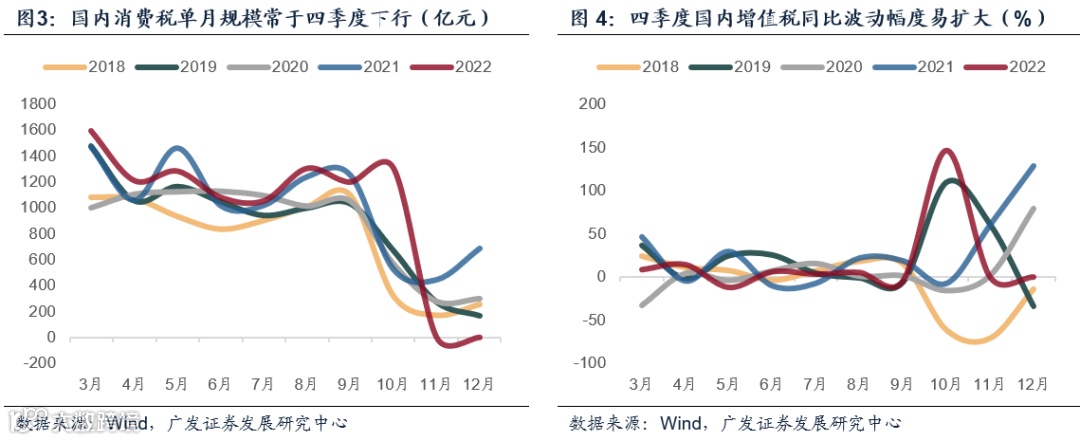 个人所得税表现略差,10月同比2.7%(前值11.2%)。表现最强的是国内消费税,同比增速147.2%,拉高10月财政收入增幅4.5个百分点。考虑到近年四季度国内消费税因税额的减少(图3)容易呈现较大的增速波动(图4),未来两个月便将出现较高基数,因此后续这一增速预计也将显著回落。