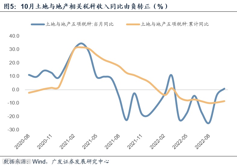 10月土地与地产相关税种合并增速0.8%(前值-4.1%),拉高公共财政收入增幅0.1个百分点(前值-0.4个百分点)。其中增速由负转微正增的主要拉动项来自房产税与契税,同比分别录得2.2%(前值3.9%)、4.0%(前值-11.9%),而土地增值税、城镇土地使用税、耕地占用税等土地相关税种降幅亦无明显扩大趋势,同比分别录得-1.2%(前值1.9%)、-2.2%(前值-2.0%)、-2.9%(前值1.0%)。