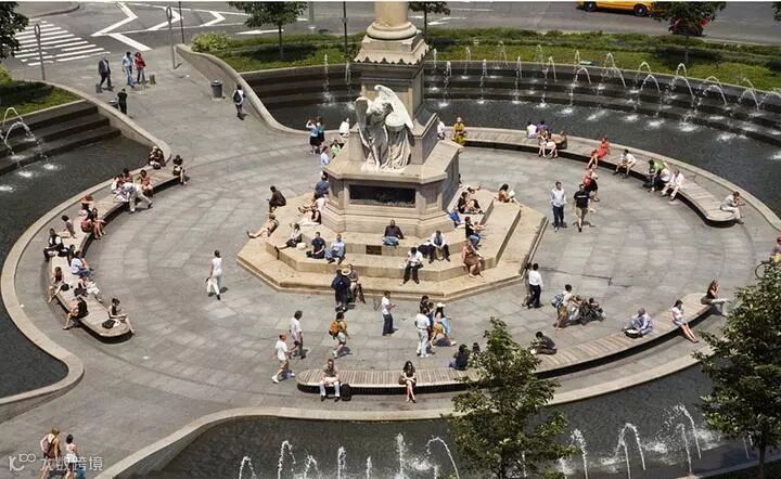 广场两边有巨大的船形喷水池,每座池都喷出3组水柱,左边靠近邮局前的喷泉代表大西洋和太平洋;右边一大片长约200公尺向下流泻的宽瀑布更是壮观,它与石山、纪念碑和喷水池遥相呼应。