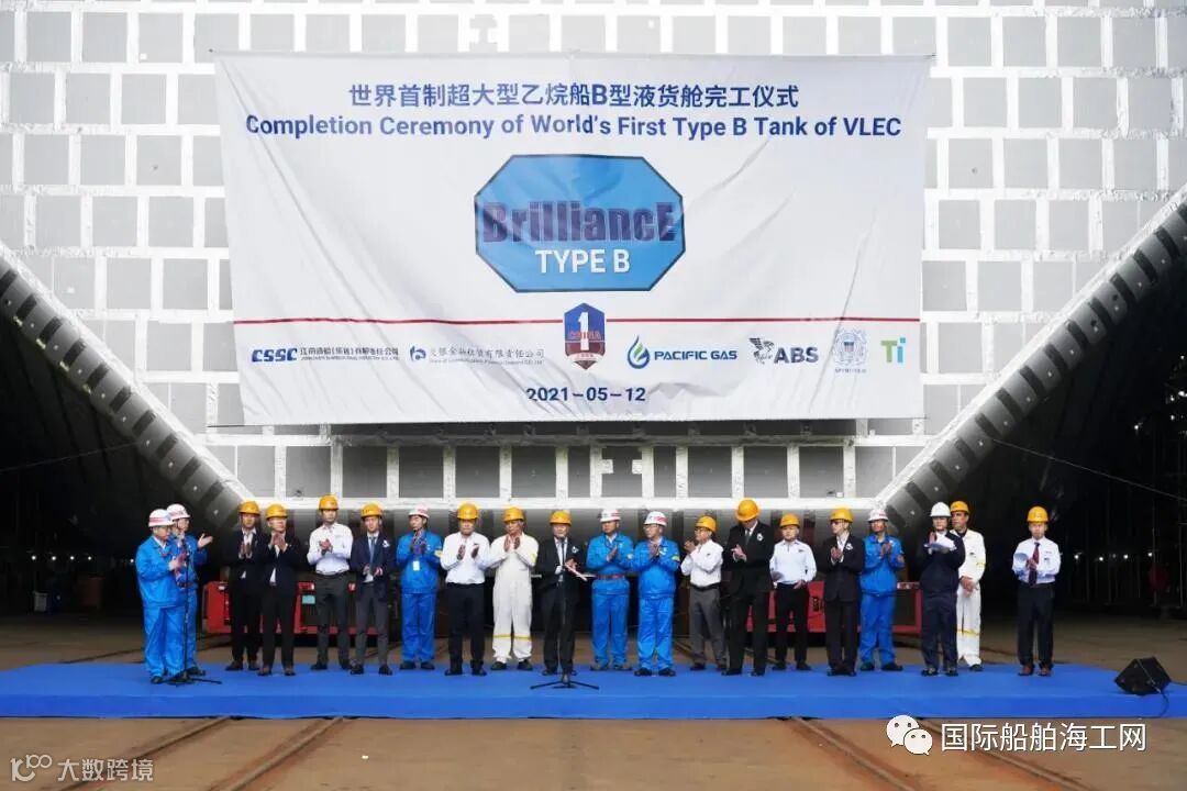 5月12日,中国船舶集团有限公司旗下江南造船(集团)有限责任公司举行世界首制99000立方米超大型液化乙烷运输船(VLEC)的首个B型液货舱完工仪式,标志着公司99000立方米VLEC建造实现关键技术突破,自主研发“BrilliancE®”货物围护系统实现工程化和节拍化生产。