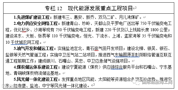 清洁能源:建设1400万千瓦光伏和450万千瓦风电项目、宁东太阳能电解制氢储能及应用示范工程;实施隆基乐叶科技年产3GW单晶电池、矽盛光电4GW单晶硅棒硅片、中车株洲风机装备制造、威力传动高精密传动设备、金晶科技太阳能光伏轻质面板、日盛高新氢能源综合利用等项目。