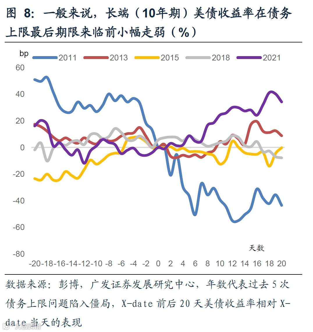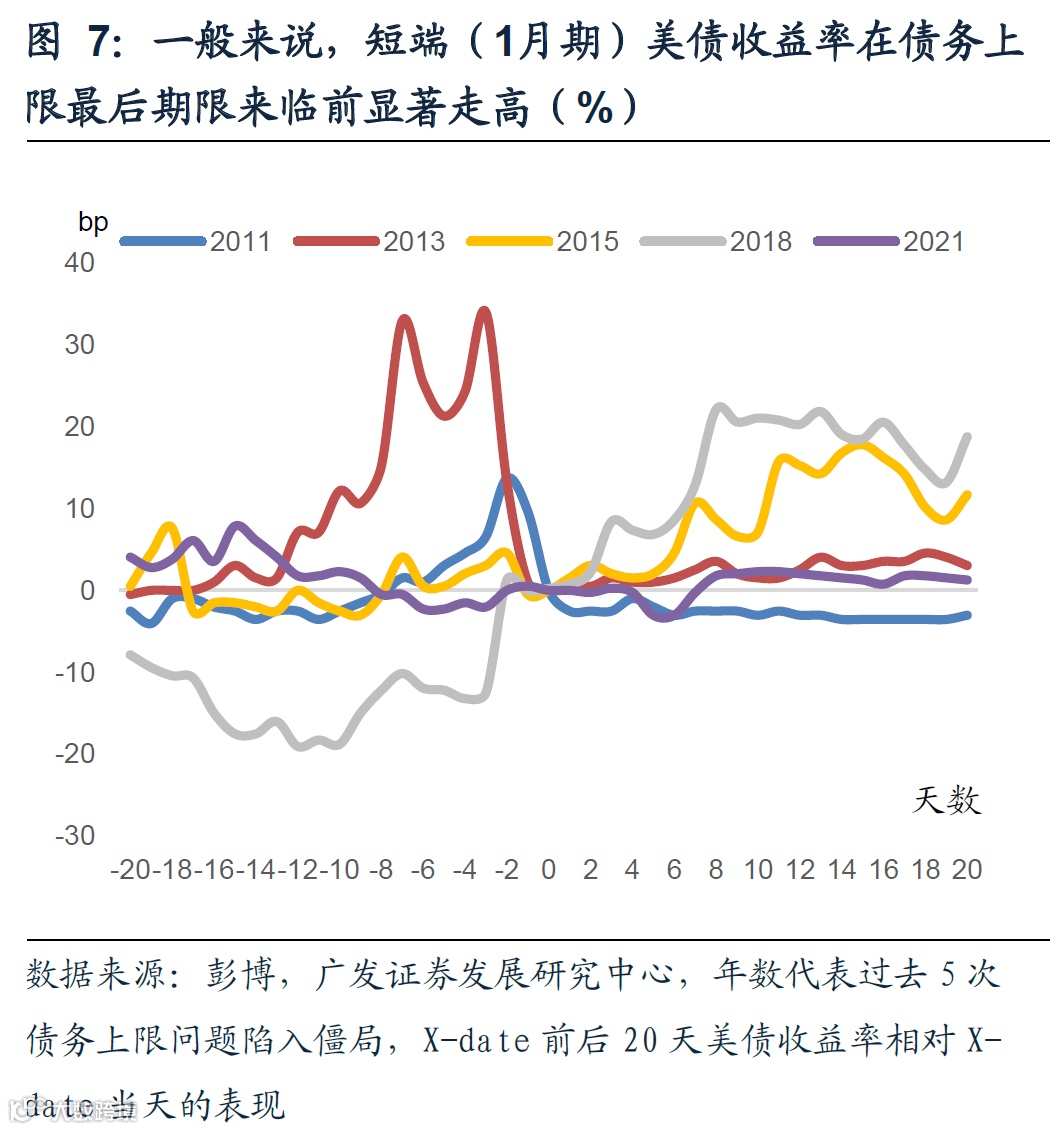 我们复盘了过去5轮债务上限问题陷入僵局、X-date临近时期美债收益率的表现,可以发现,短端美债收益率在债务上限陷入僵局并快要到期前有较显著上行,长端美债收益率总体处于回落态势。