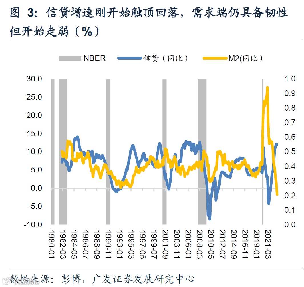 信贷增速仍处于高位但开始回落,显示在实际利率持续走高的背景下,需求端仍具备韧性但开始走弱,从历史经验来看,在信贷增速持续快速回落时期一般对应需求转弱进而引发经济衰退。