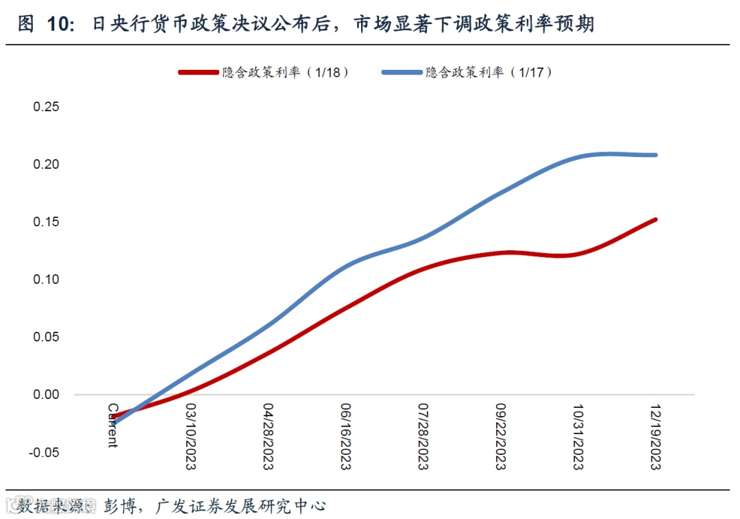 从资产价格的角度来看,市场在12月会议后不断price in日央行货币政策收紧的预期,一方面导致日元兑美元汇率快速走强(日元升值),美元指数回落;另一方面,日债收益率上升,流动性收紧也在一定程度上支撑美债收益率上行。因此,本次日央行保持货币政策不变的结果,导致市场对日央行加息的预期快速降温,日元兑美元汇率回落(日元贬值),日债收益率跳升。展望来看,我们认为,日央行货币政策常态化调整已经启动,市场现阶段对货币紧缩的交易(比如放弃YCC)无可厚非,但日央行在1月货币政策会议中对通胀以及经济谨慎的态度明确显示,退出超宽松货币政策的过程将是渐进的、逐级的,仍然需要通胀和经济数据的支持。