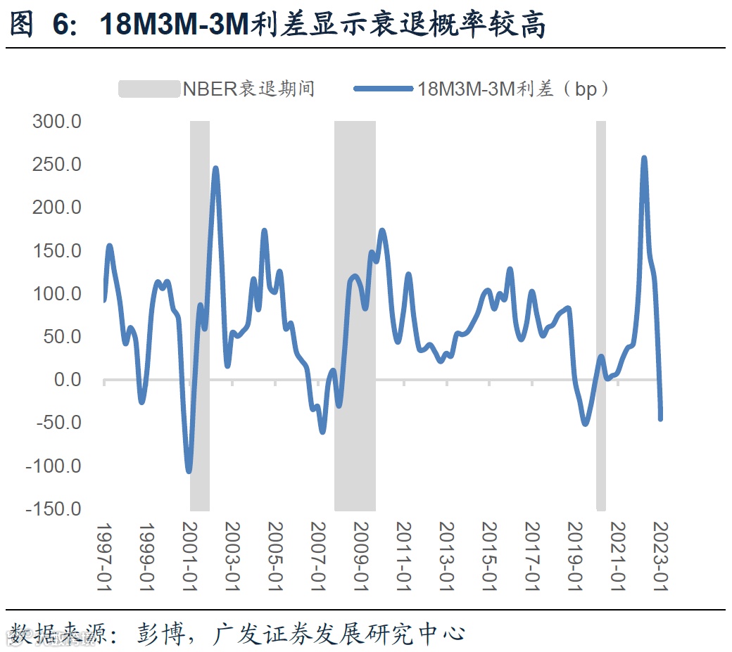 从经验规律上来看,我们可以观测2Y10Y、3M10Y、以及18M3M-3M利差,三者均显示美联储激进加息导致短端利率快速上行,收益率曲线维持倒挂。其中10Y3M利差在1月17日达到-100bp,利差水平甚至低于2007-08年次贷危机时期的最低水平(-56bp), 10Y2Y利差达到-70bp,18M3M-3M利差为-46bp,均接近于历史最低水平。从历史经验来看,在三方面利差都处于负值后,经济陷入衰退的概率非常高。