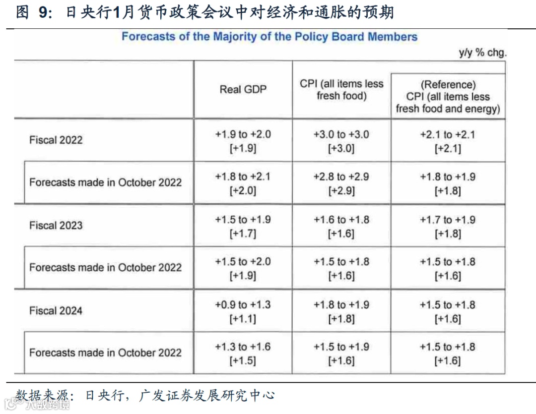 其次,在1月货币政策声明中(Statement of Monetary Policy),日央行下调了2022、2023和2024财年的经济预期,显示日央行对经济动能预期仍保持谨慎态度。此外,日央行在2022年12月会议中提到海外经济衰退风险以及对日本经济和通胀可能产生的影响,因此,日央行更可能放缓货币政策正常化的节奏,给自己留有更多时间来观察海外衰退风险对日本的外溢作用。