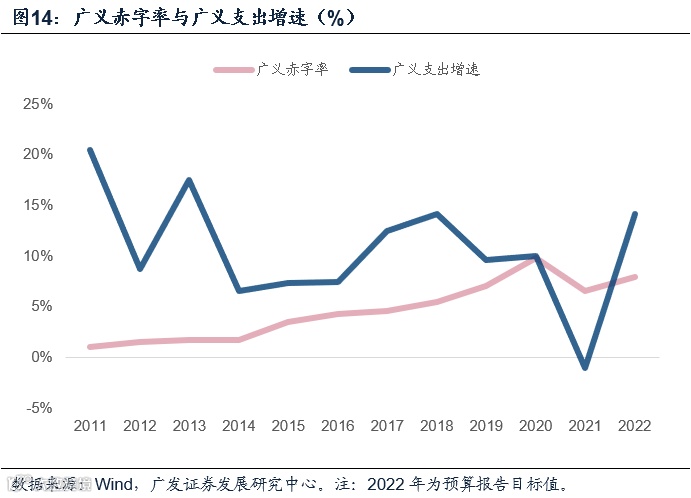一方面反映了2022年狭义财政在赤字规模方面有所收敛,重点放在广义财政的扩张之上(根据预算报告,2022年广义赤字率预计达7.5%-7.9%左右,较去年的6.6%-7.0%显著提升,广义支出增速预计12.8%-14.2%左右,较去年的-2.4%显著提升);另一方面,近年来随着目标赤字率变化对总财政支出的边际影响的下降,2.8%赤字率与中期衔接的政策信号意义大于实际意义。