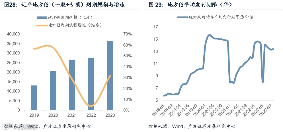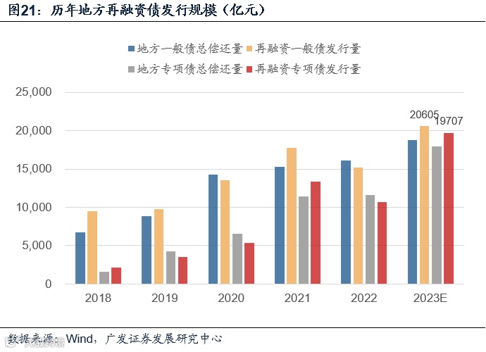 同时我们还需考虑再融资类地方债,即再融资一般债与再融资专项债。数据显示,2023年将到期一般债约1.9万亿元、到期专项债约1.8万亿元,共计约3.7万亿元,较今年环比多增约0.9万亿元。