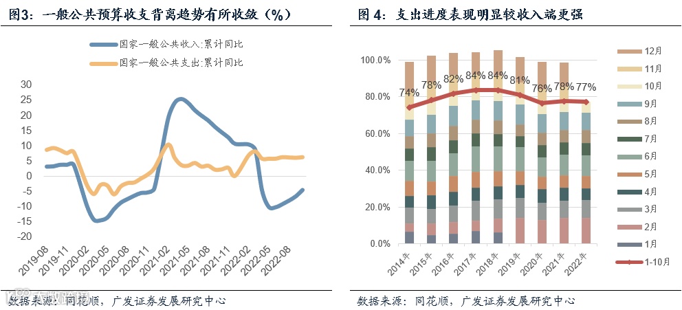 进入下半年,收入端逐渐修复。随着上述两项因素的逐渐褪去,一般公共预算收入同比也转负为正,呈逐级上台阶趋势,1-10月累计同比也由-10.2%收敛至-4.5%,较年初预计增幅相差3.7个百分点,大幅追赶了上半年落下的进度。