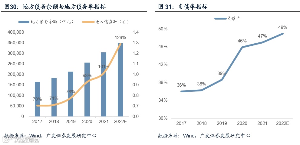 二是负债率指标,该指标也在不断升高。2019年末政府负债率为39%,2022年末负债率指标预计将上行至49%-50%左右。