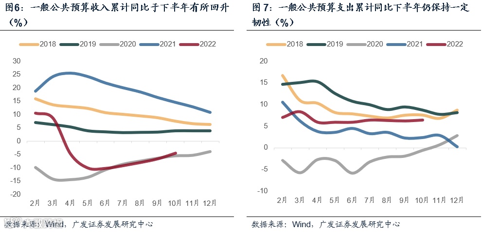 考虑到11-12月基数较低,预计2022年全年可比口径下(留抵退税前)一般公共预算收入增速将较1-10月的5.1%进一步上升至10%左右,自然口径下(留抵退税后)一般公共预算收入增速将较1-10月的-4.5%进一步上升至-1%左右。这一增速对应的一般公共预算收入规模约在22万亿元左右(含2.2万亿元左右的留抵退税部分)。