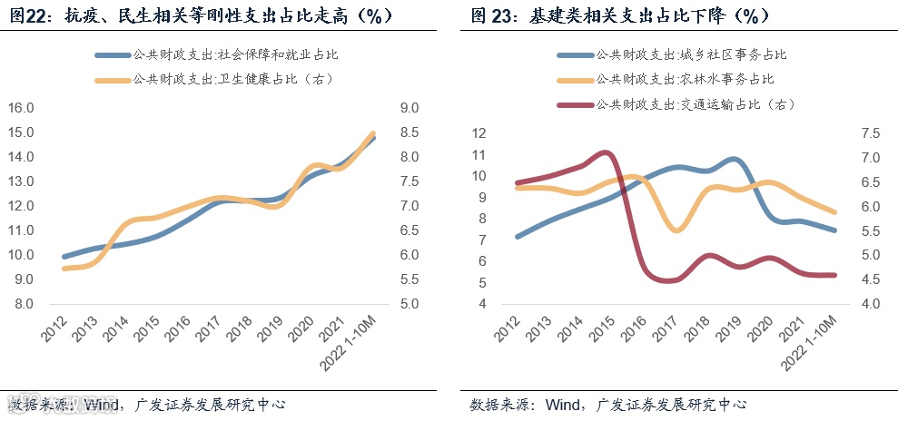 2023年我们根据测算得到的广义支出增速不高。主要源自2022年的较高基数问题(图14),2022年广义财政支出中包含有上文提到的1.65万亿元特定国有金融机构和专营机构上缴利润支撑,同时狭义财政中还有较高比例的抗疫民生类刚性支出支撑(图22)。此外,2023年收入端的修复弹性、上文提到的债务率指标、存量可用于“调剂”的财政资金规模明显收缩等因素也同时掣肘了广义财政支出端的扩张。