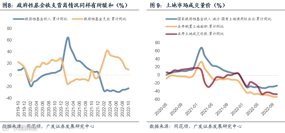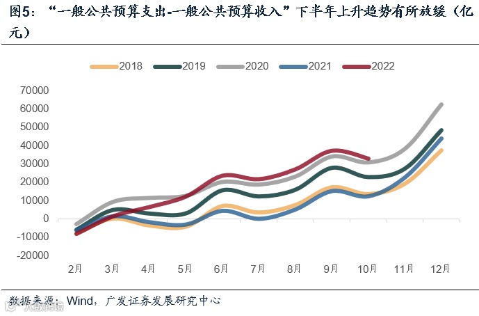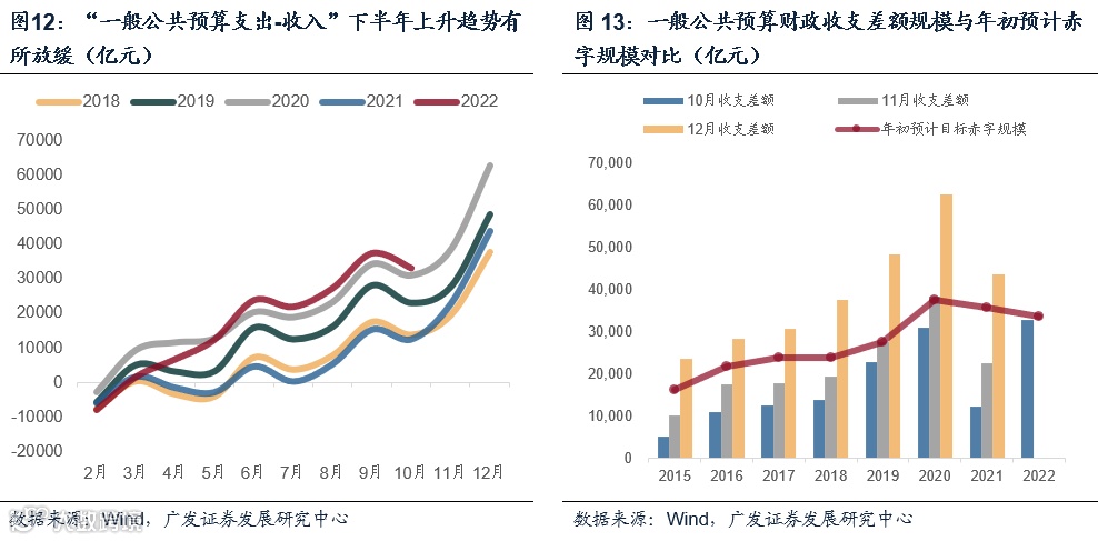 2022年下半年这一情况有所缓和,随着减税政策接近尾声、经济初步见底企稳、地产领域主要指标降幅不再扩大等因素,财政两本账的收入端均呈现一定程度的修复。收支两端显著背离的现象有所收敛,1-10月一般公共预算收支差为32937亿元,仍小于年初预算的目标赤字规模33700亿元,即总体收支差额仍处于可控状态;类似地,1-10月政府性基金预算收入累计同比由上半年的-28.4%回升至-22.7%,支出累计同比由上半年的31.5%下行至9.8%。