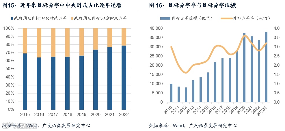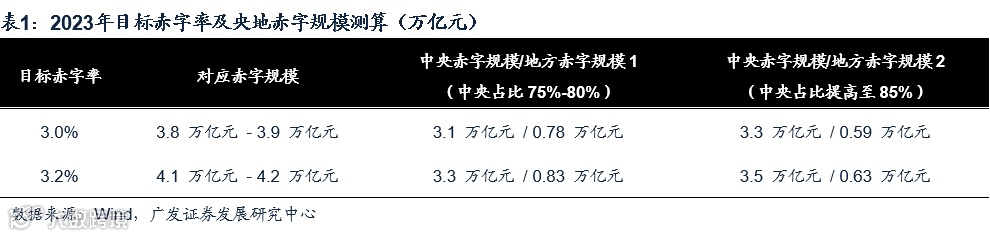 第一,2023年稳增长需求仍高,且赤字率这一指标的政策信号意义较强,全年的目标赤字率上升是大概率事件。我们预计2023年目标赤字率上行0.2-0.4个百分点至3.0%-3.2%。