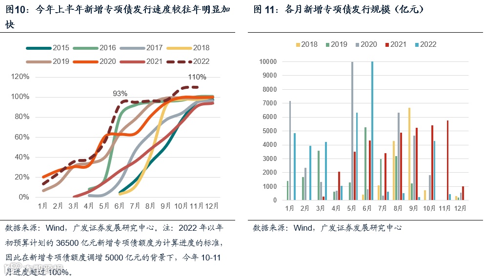 二是对于专项债余额限额空间的使用,2022年下半年通过对1.5万亿元左右的余额限额空间[3]的盘活,追加了5000亿元的新增专项债,基本在10月发行完毕,其中包括河北、山东、四川、福建、河南、云南等多个省市。