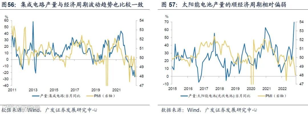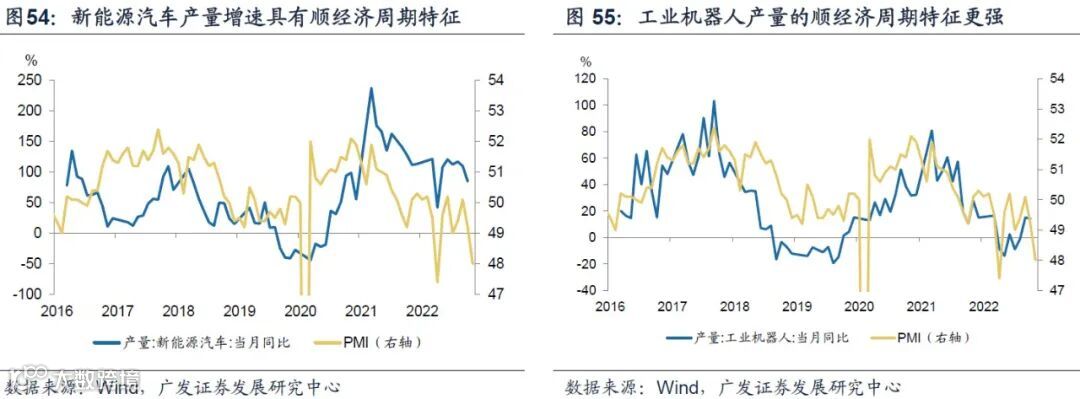 从上述新兴产业核心产品的产销数据来看,新能源汽车、工业机器人、集成电路、太阳能电池等均具有明显的顺周期特征,尤其是工业机器人和集成电路。相对而言,新能源汽车、太阳能电池等双周期特征相对偏弱一些,可能与逆周期政策刺激有一定的关系。与此同时,移动通信基站设备则呈现明显的逆周期特征。