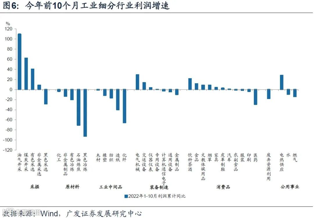 1-10月,采掘利润占比20%为历史新高水平;原材料利润占比19.2%,低于2021年的27.2%和过去5年均值的24%;中间品利润占比4.1%,低于2021年的5.5%和过去5年均值的6.5%;装备制造利润占比26.1%,持平2021年,与过去5年平均水平(26.4%)基本相当;消费品制造利润占比24.3%,低于2021年的25.2%和过去5年均值(28.4%);公用事业利润占比5.9%,好于2021年的3.5%,略低于过去5年均值的6.2%。