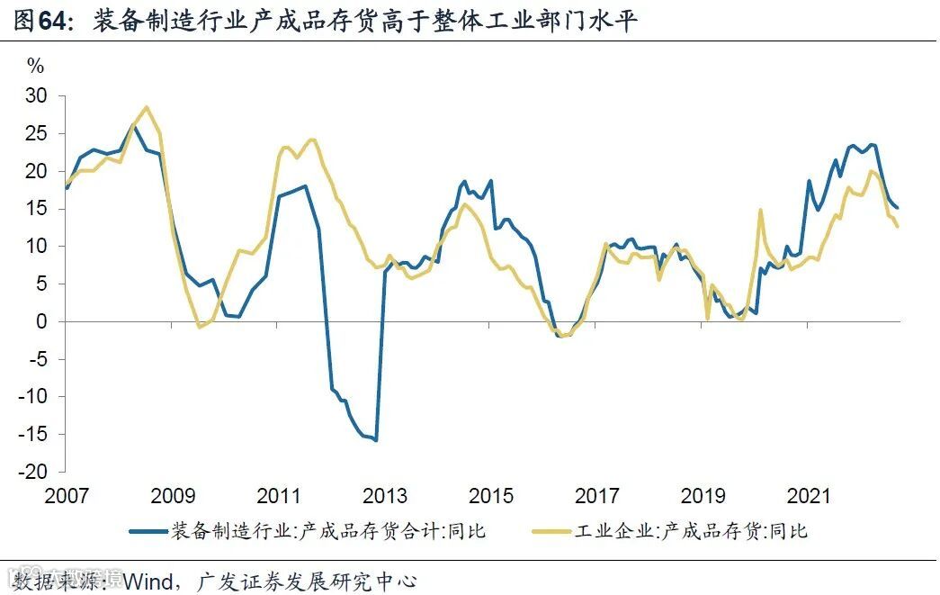 2023年中游装备类面临的两大压力来自于需求的回落和库存去化。需求方面,中游装备类制造业短期景气与出口保持高度一致,2023年出口将跟随外需继续放缓。库存方面,截至10月,中游产成品存货同比15.1%,仍是2015年以来新高,短期内仍面临一定库存去化压力。