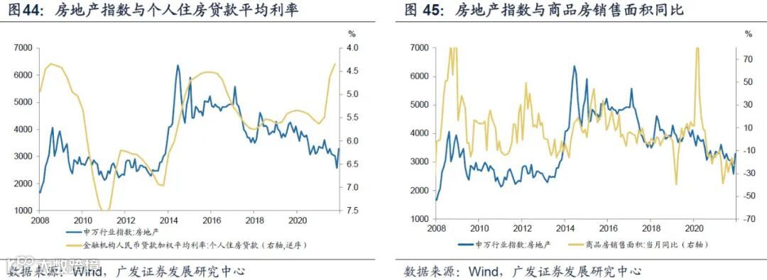 房地产行业指数历史上与金融机构个人住房贷款平均利率趋势呈现明显的负相关关系,但在今年以来二者出现背离。