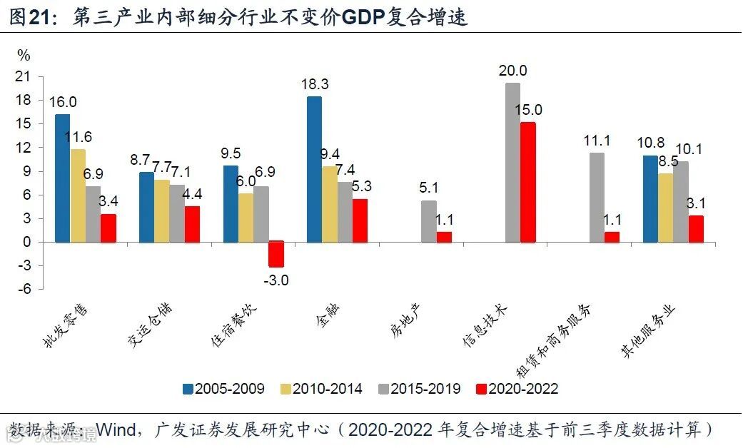三大产业中,第三产业与疫情前差距最大。根据不变价GDP增速,疫情以来(2020-2022年前三季度),第一、二、三产业复合增速分别为4.7%、5.0%、4.0%。第三产业显著低于过去十年复合增速的8.4%及2015-2019年复合增速的8.1%。