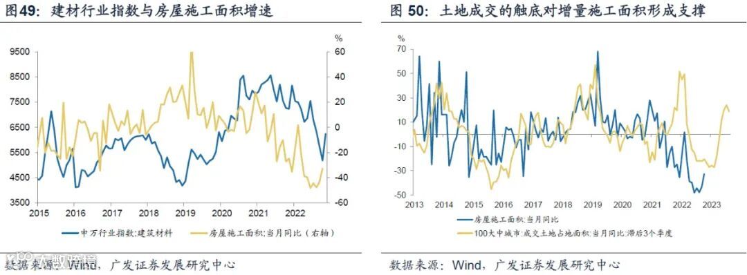 2023年中观面修复主线之二是地产产业链企稳。从地产竣工线索看,家电、家具类零售增速与期房销售滞后2年左右、现房销售滞后半年左右趋势一致;2023年地产竣工的修复有三重支撑:一是2021年上半年期房住宅销售面积仍保持了30%的高增,二是“保交楼”政策发力背景下今年推迟竣工需求的释放,三是各地保障性租赁住房建设以全装修交付为主。从地产施工线索看,从“2023年新开工、2022年正在施工、2023年净复工、2023年竣工”四大影响因素来看,至少目前已经看到在新开工和净复工两大层面出现积极信号,前者的支撑来自于2022年初步触底回升的土地成交,后者来自于“保交楼”政策落地。
