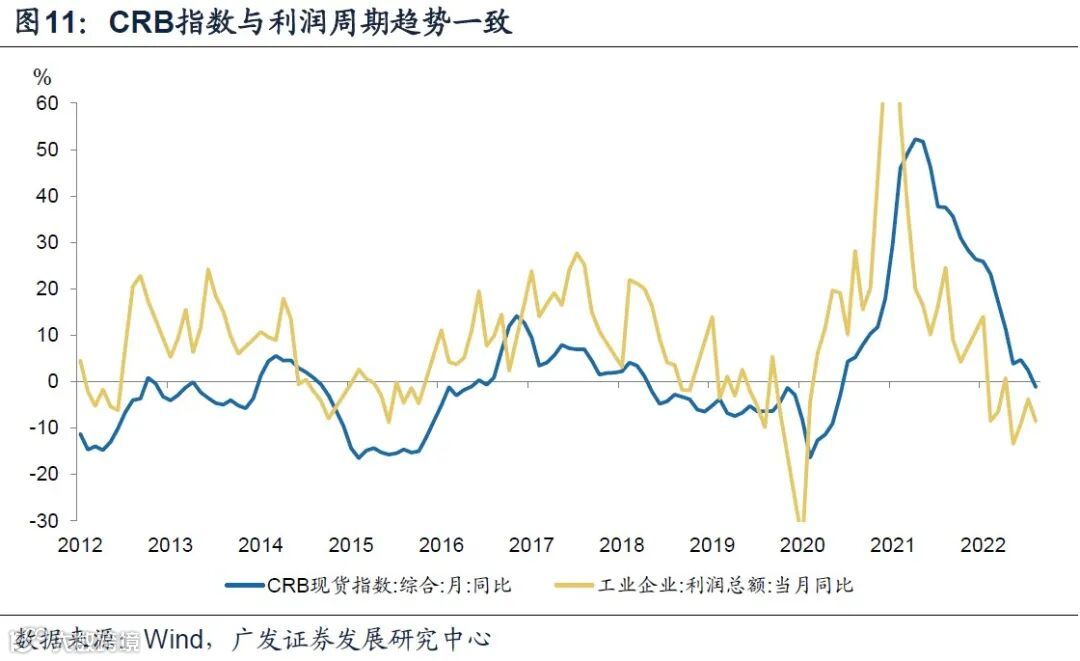 以CRB环比不变推演,则同比底部处于2023年4月,从数据历史经验来看,CRB指数与利润周期趋势高度一致。