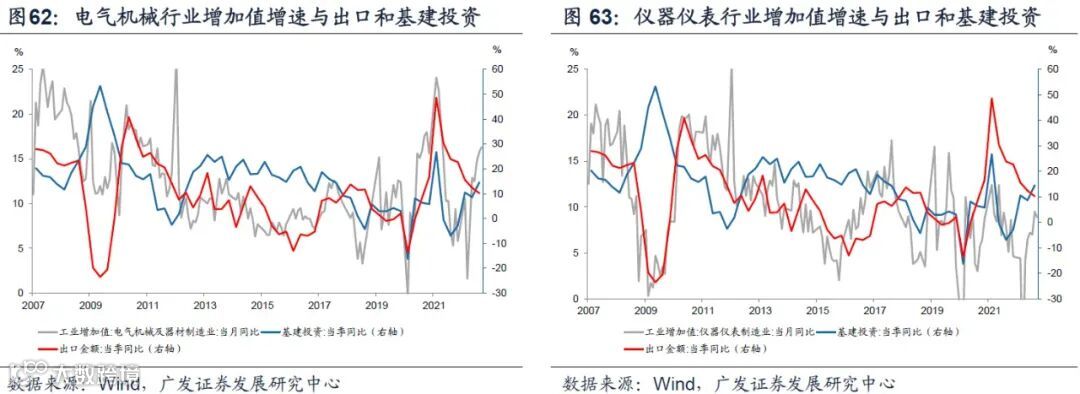 电气机械、仪器仪表等行业增加值增速在上述两个阶段与基建投资趋势较为一致。
