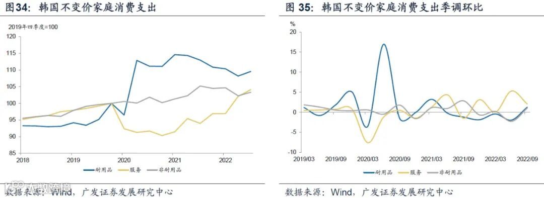 与美国相同的是,每一轮疫情管控措施的放开,韩国居民服务消费支出均会出现1-2个月的环比脉冲;不同之处在于,一则环比脉冲幅度弱于美国,二则韩国服务消费修复环比脉冲最强的是出现在全面放开之后,即2022年2-3季度。
