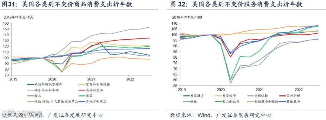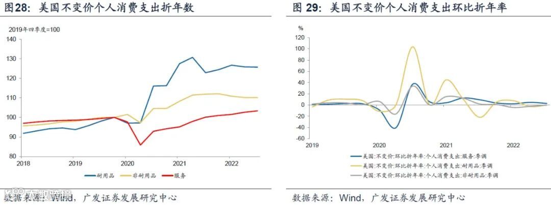 (2)半耐用品消费支出与服务修复节奏一致,修复斜率却更快;2021年4季度季调环比为35.7%;2022年2-3季度分别为23.1%和20.4%。