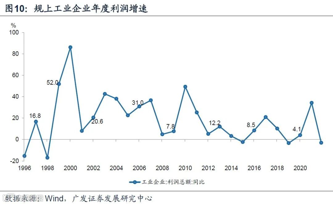 利润周期的数据规律显示,每一轮利润周期低点的次年,利润年度增速全部转正,例如,2009年为7.8%,2013年为12.2%,2016年为8.5%,2020年为4.1%,增速平均水平为8.1%。