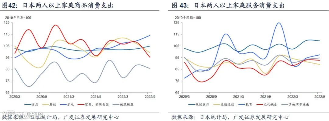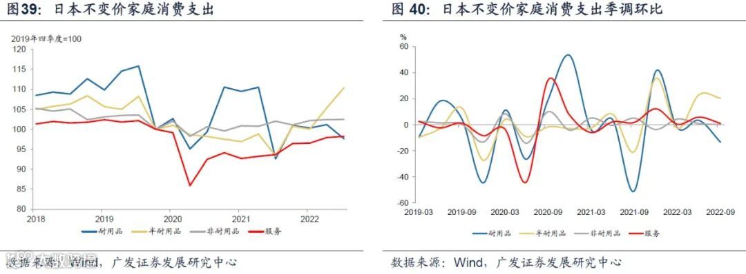 日本从2021年下半年开始疫情管控放开后,服务消费支出和半耐用品消费支出呈现加速恢复趋势,由于疫情防控仍然维持在较严格的水平,2022年3季度服务消费支出也仅恢复至疫情前的98.2%。耐用品消费支出与美、韩一样出现了持续1年左右的高速增长,随着疫情防控措施优化后出现持续下降。