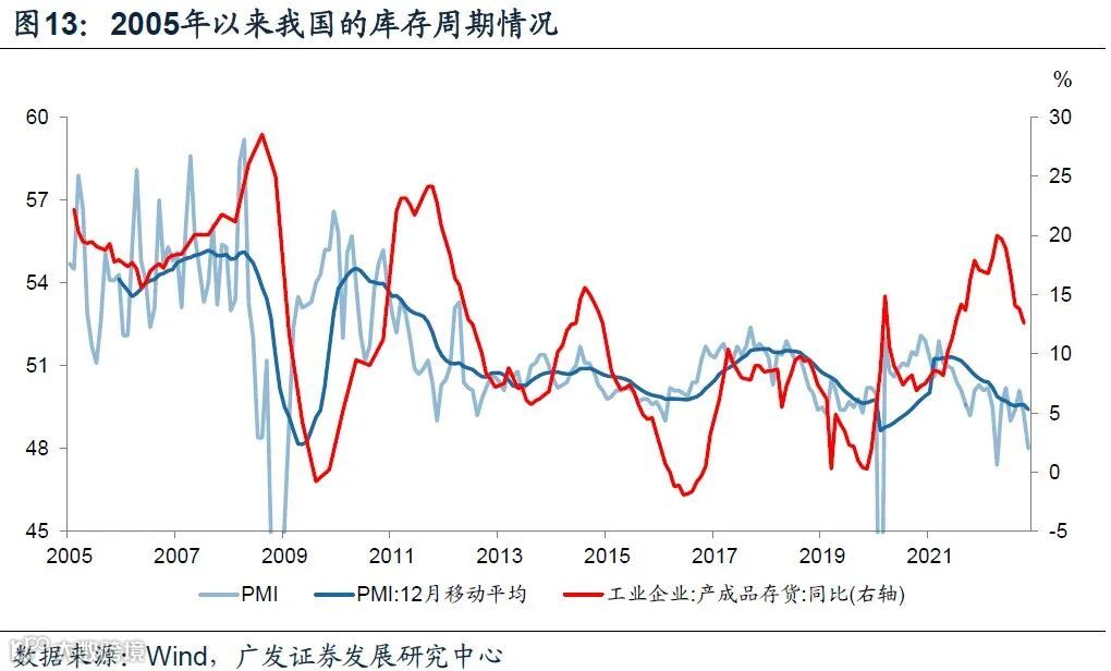 以社融脉冲(12月累计求和同比变化)来代表政策周期,以制造业PMI来代表经济需求,以规上工业企业产成品存货代表企业库存。数据历史规律显示,社融脉冲低点对制造业PMI低点的领先性在1-8个月左右;社融脉冲低点对产成品存货的领先性在12个月左右,最长的是2013年,社融脉冲领先库存底部20个月。