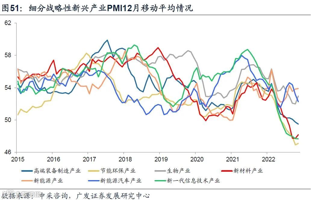 回顾2022年,新兴产业呈现景气走弱、利润大幅下降、投资保持高速增长的特征。细分行业方面,新能源、生物产业、新能源汽车平均景气相对领先。