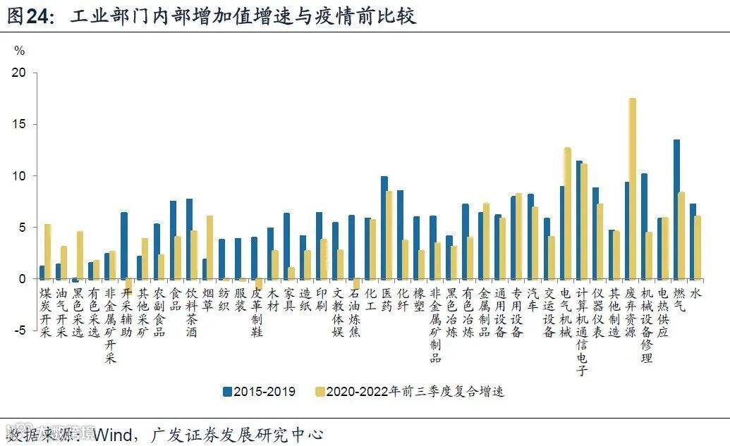 进一步理解工业部门,显著低于疫前增速的行业集中在原材料、中间品、消费品尤其是与出行和地产后周期相关的消费品类、装备制造中的交运设备和仪器仪表、燃气,基本上对应以下三条终端需求线索:一是地产投资下行的影响;二是居民生活半径缩短的影响;三是地方财政压力导致相关投资减少的影响。